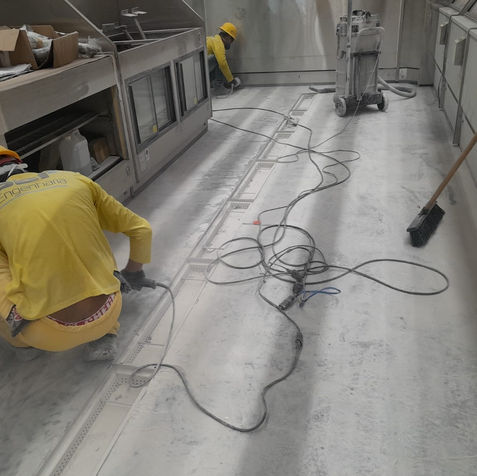 A intervenção compreendeu a criação de novos ambientes conforme o layout e as funcionalidades definidas para as áreas de produção e atendimento ao cliente, incluindo a execução das câmaras frias do açougue. Foram realizados diversos serviços de engenharia civil, como demolições internas de piso e paredes, escavações para fundações e instalações, concretagem de bases e pisos, impermeabilização, regularização e aplicação de novos acabamentos.