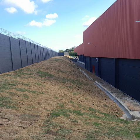 Em seguida, foram montadas as gaiolas de gabião, preenchidas com material selecionado, e implantado o sistema completo de drenagem com canaletas. A obra foi finalizada com o plantio de grama para proteção do talude e integração paisagística do estabelecimento.