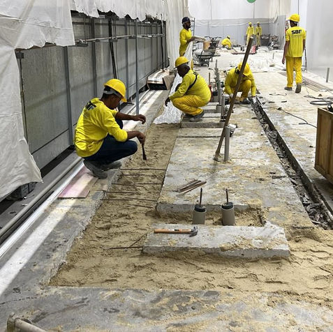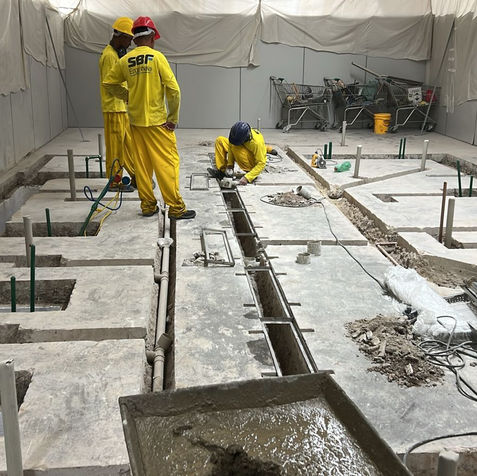 A intervenção compreendeu a criação de novos ambientes conforme o layout e as funcionalidades definidas para as áreas de produção e atendimento ao cliente, incluindo a execução das câmaras frias do açougue. Foram realizados diversos serviços de engenharia civil, como demolições internas de piso e paredes, escavações para fundações e instalações, concretagem de bases e pisos, impermeabilização, regularização e aplicação de novos acabamentos.